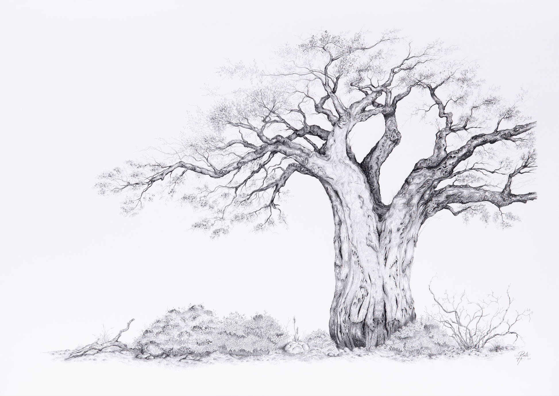 Rooted in strength and shaped by time, the baobab tree stands as a quiet symbol of resilience and beauty. This pencil drawing captures its striking form — bold, grounded, and full of character. There’s a calm energy in its presence, almost as if it’s holding stories from centuries past. Created with intention and care, the piece brings the stillness and wisdom of the African landscape into focus.