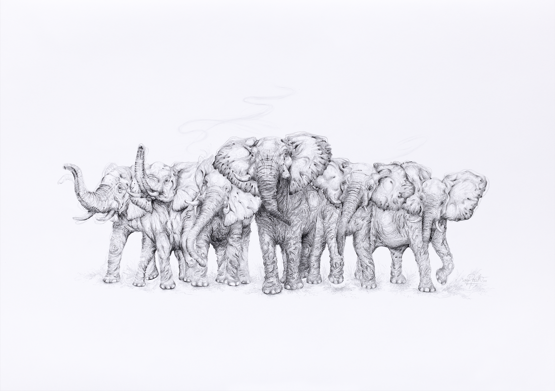 This pencil drawing captures a single elephant mid-motion — full of presence and quiet power. One ear flaps outward as if catching the wind, while its trunk lifts to toss a cloud of dust into the air. There's a raw energy in its stance, each detail drawn to reflect movement, instinct, and emotion. Forward-facing and alive with expression, the piece holds a moment where strength and power meet in motion.