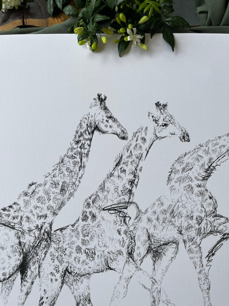 I recently bought a black and white sketch of giraffes it’s quickly become one of my favorite pieces. There’s something incredibly powerful about the simplicity of this monochrome piece— and this sketch captures that essence perfectly.